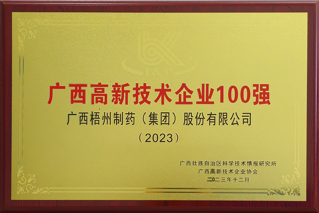 梧州制藥獲評(píng)2024年廣西高新技術(shù)企業(yè)100強(qiáng)