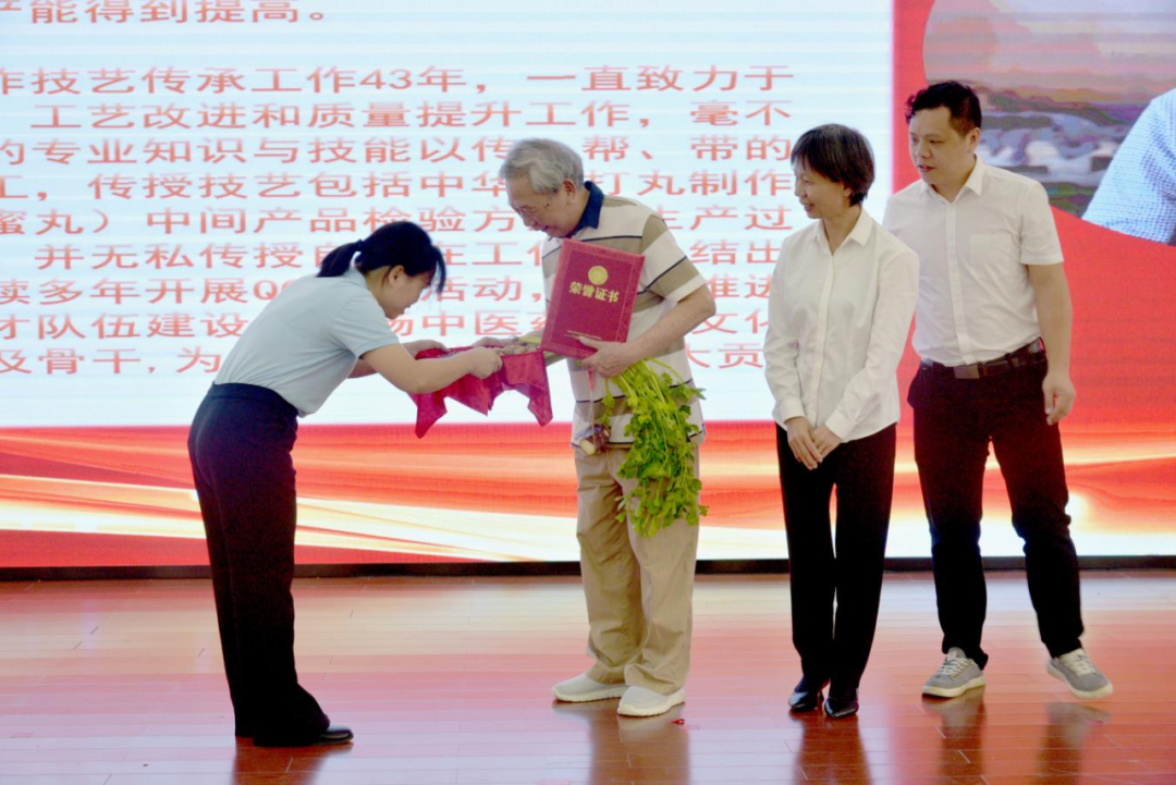 活動還專門邀請了中華跌打丸獻方人陳鐵的兒子,現(xiàn)已83歲高齡的原跌打丸生產(chǎn)車間主任陳永強到會,由公司黨委書記、董事長黃文彩為其頒發(fā)“中華跌打丸制作技藝——金牌師父”榮譽稱號。“中華跌打丸制作技藝”的第三、第四、第五代非遺傳承人依次上臺,同樣用傳統(tǒng)的束脩六禮對陳老進行了謝師,以此來表達對師父的感激之情、教導之恩。