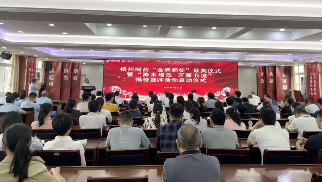4月24日上午,一場感恩與奮進的“金牌師徒”頒獎儀式暨“降本增效 開源節(jié)流”揭榜掛帥活動啟動儀式隆重舉行。梧州制藥領導班子成員,各部門、各車間職工代表,及獲評星級的“金牌師徒”共150余人參加活動。