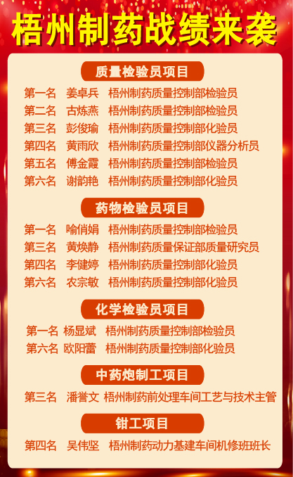 3金1銀3銅,梧州制藥45名職工在2024年梧州市職工職業(yè)技能大賽中秀絕活、展風(fēng)采、創(chuàng)佳績。在角逐中藥炮制工、質(zhì)量改進(jìn)員、藥物檢驗(yàn)員、化學(xué)檢驗(yàn)員、維修電工、焊工、鉗工等7個項(xiàng)目比賽中創(chuàng)下歷史最佳成績。