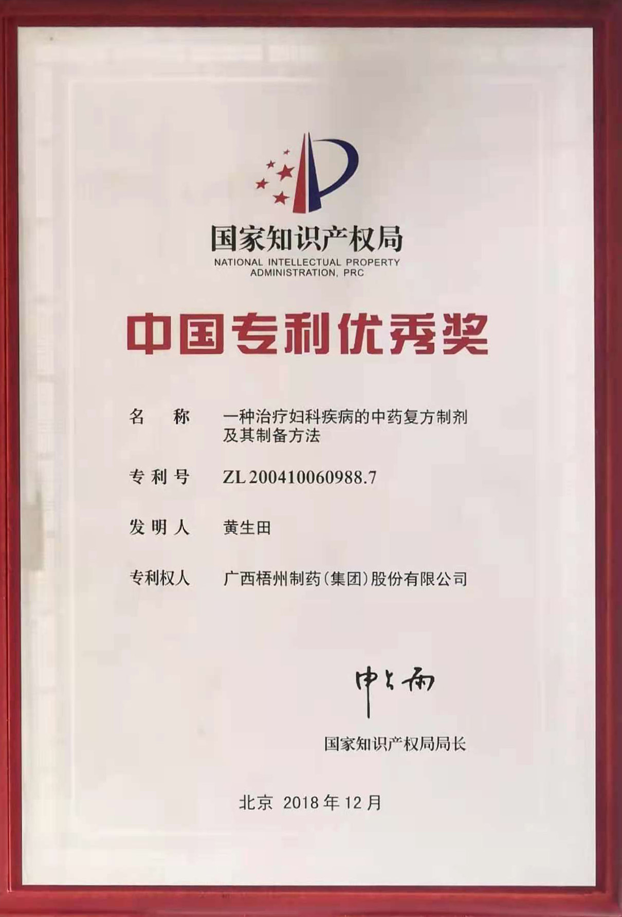 黃生田參與的《一種治療婦科疾病的中藥復方制劑及其制備方法》項目榮獲中國專利優(yōu)秀獎。